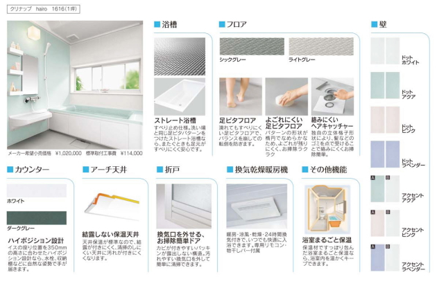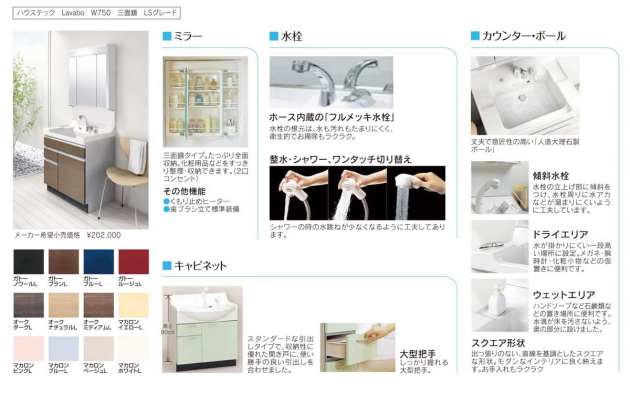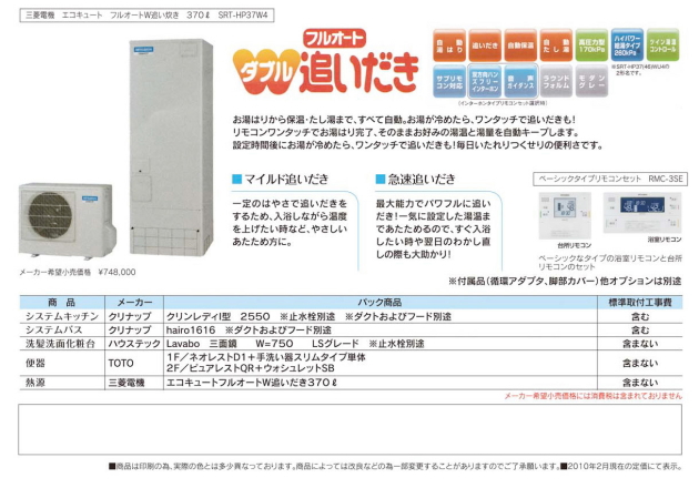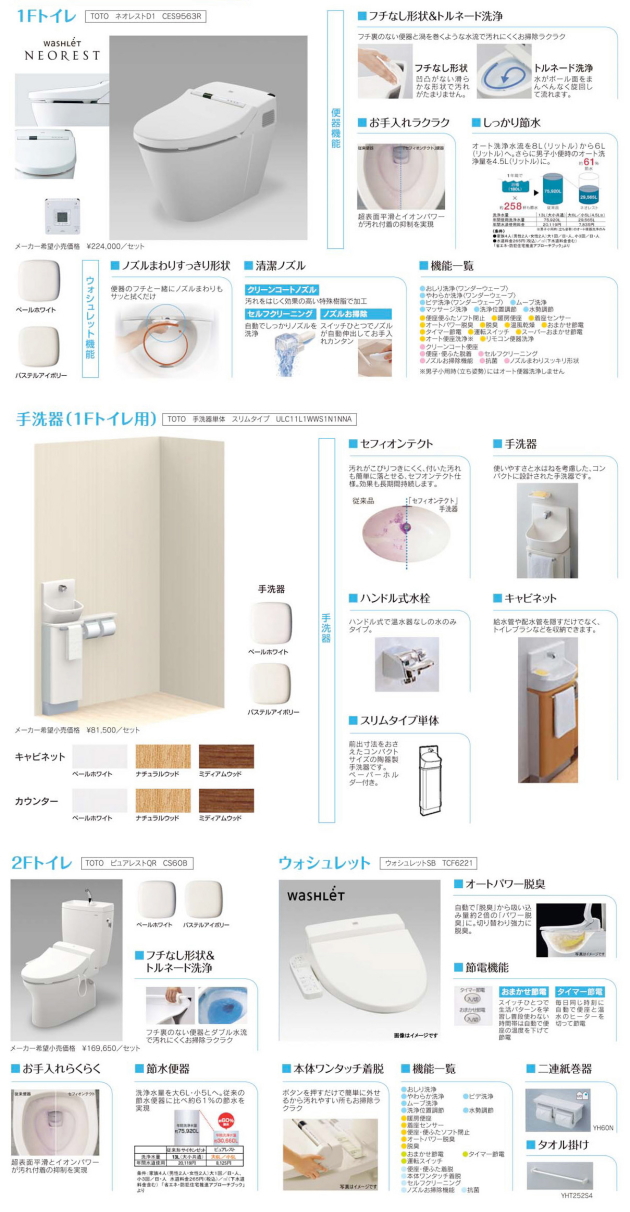 | スタンダードプラン ■例1 キッチン(クリナップ クリンレディ) \570,000 洗面化粧台(ハウステック Lavabo750) \92,000 トイレ(TOTO ネオレストD1) \202,000 合計 \907,200(税込み) *別途施工費がかかります ■例2 システムバス(クリナップ hairo1616) \380,000 トイレ(TOTO ピュアレスト) \104,000 三菱エコキュート 370リットル \340,000 合計 \865,200(税込み) *別途施工費がかかります *エコキュート設置に電気工事代がかかる場合があります ■例3 システムバス(クリナップ hairo1616) \380,000 トイレ(TOTO ネオレスト) \202,000 トイレ(TOTO ピュアレスト) \104,000 合計 \720,300(税込み) *別途施工費がかかります その他自由に組み合わせできます お気軽に問い合わせ下さいませ。 |